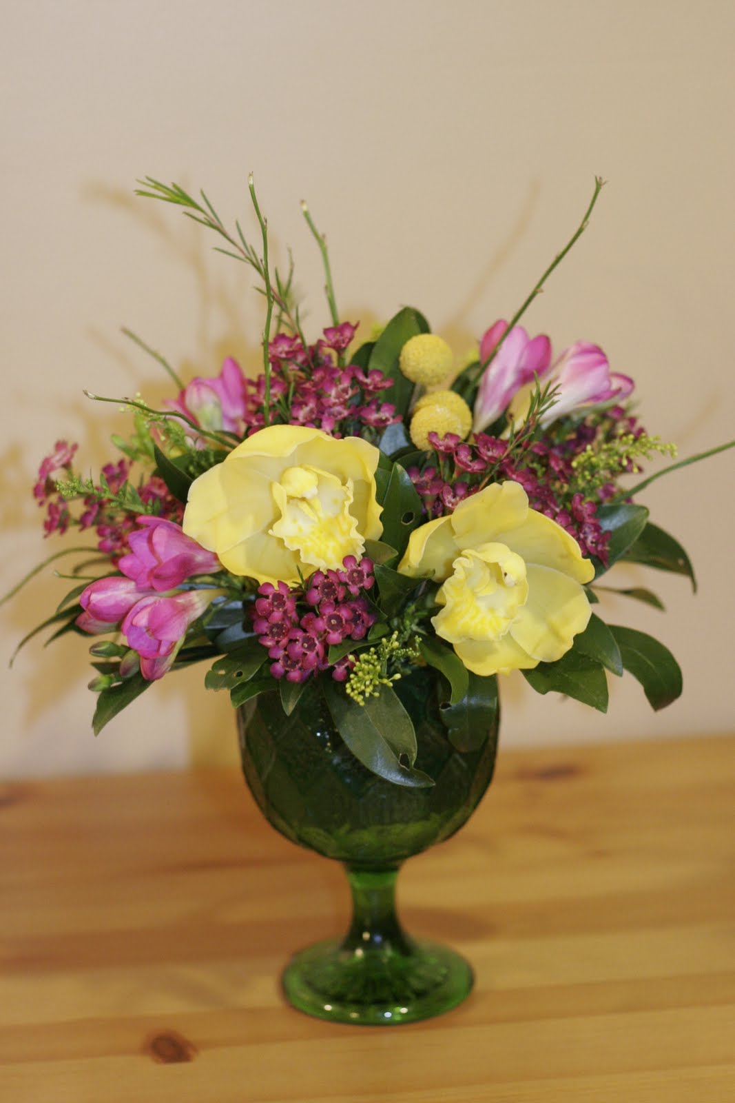| Yellow mini cymbidiums, waxflower, pink freesia, crespedia |